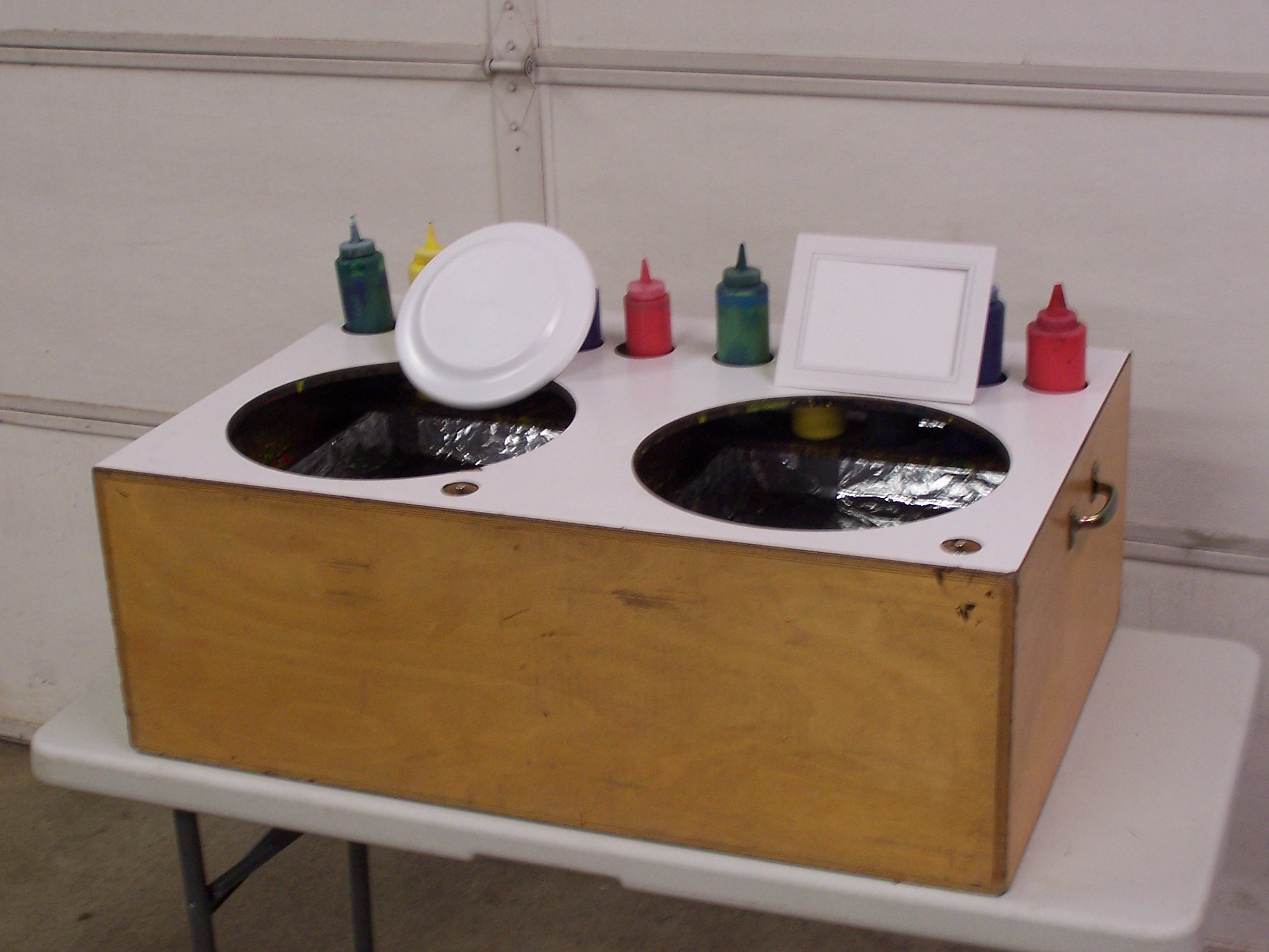 A unique hands-on attraction that allows for anyone to be a Picasso! With 2 separate bays, allows for quick turnover of participants. Can be set up to paint either 5″ x 7″ cards or Frisbees. This tabletop unit is a great addition to any school or church carnival.